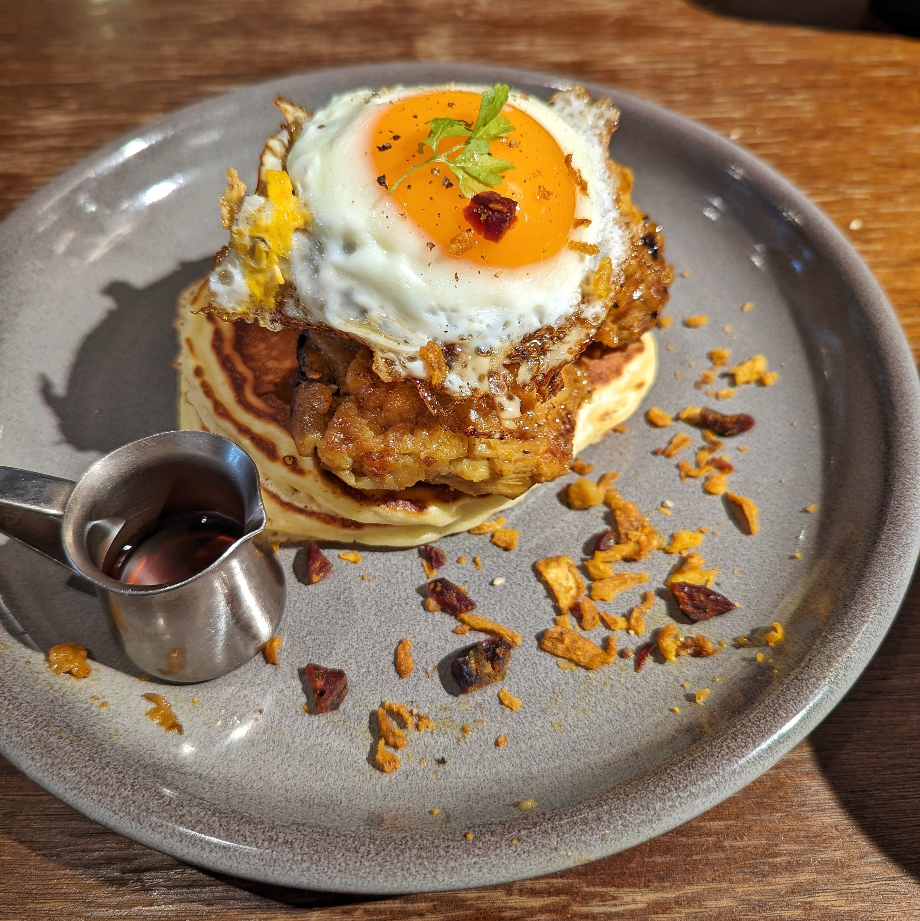 For savoury we couldn’t go past the maple chicken and fried eggs and holy cow, when I tell you this dish is all you need to justify a visit here, I mean it. This option is served on top of Flipper’s’ American-style pancakes which have more substance than the kiseki pancakes but still with a certain level of fluff to them. I’m not always in the mood for maple fried chicken as it can feel pretty heavy and rich, however, the chicken pieces here are so meaty that they didn’t feel oily at all. The pieces are flavoured with a 5-spice mix that is reminiscent of Ayam Goreng (Malaysian fried chicken) and is beautifully complimented by pecan butter and maple syrup. I’m gonna go ahead and say it’s one of my favourite dishes I’ve had this year.